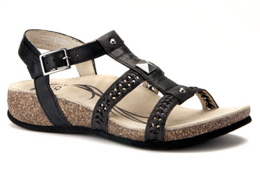 The Walking Company is selling a brand of shoes, ABEO, with a nice sandal option. It has a cork foot bed which is fairly rigid, offloading the front of the foot and a moderate arch support. Other sandals from this brand are available with the same great foot bed.