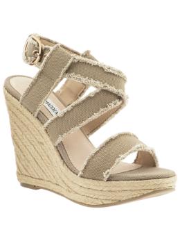 A wedge espadrille sandal by Steve Madden. Soft straps and wedge bottom. This one may be too high for those with unstable ankles.